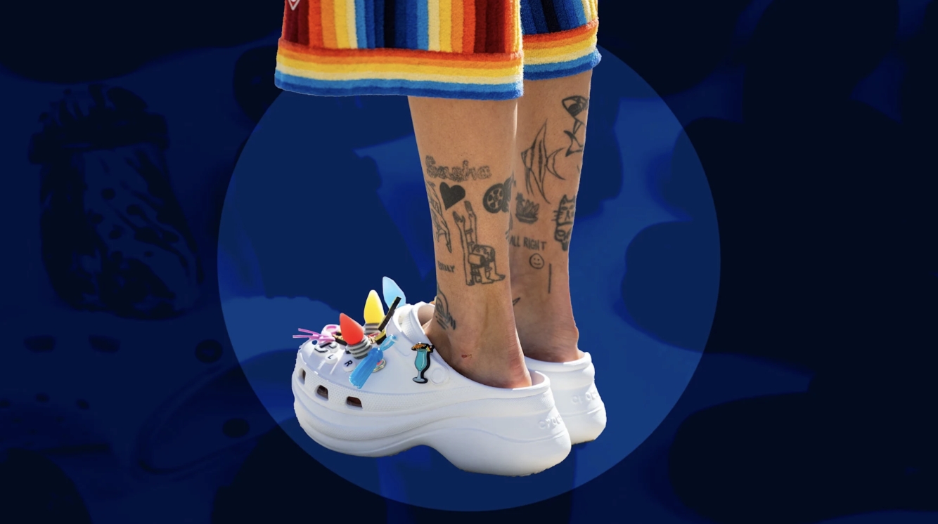 以CROCS洞洞鞋为例。这个曾被时尚界嘲笑的品牌,通过大胆联名拥抱怪诞特质,成为点睛之笔:以大胆舒适的瞬间点缀生活。2023年其营收达39.6亿美元,同比增长近12%。这才是真正的笑到最后。