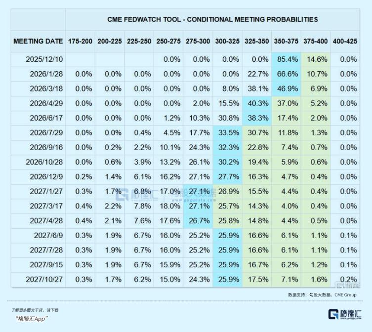 据CME“美联储观察”:美联储12月降息25个基点的概率为85.4%,高于上周的50%。美联储到明年1月累计降息25个基点的概率为66.6%,维持利率不变的概率为10.7%,累计降息50个基点的概率为22.7%。