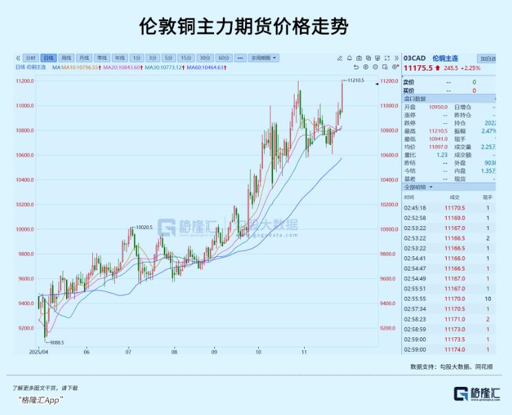 周五晚,伦铜期货主力合约大涨2.25%,盘中最高报11210.5美元/吨,创下历史高记录。同时国内铜主力合约和美国纽约铜期货价格也分别强势上涨了1.75%、1.62%。