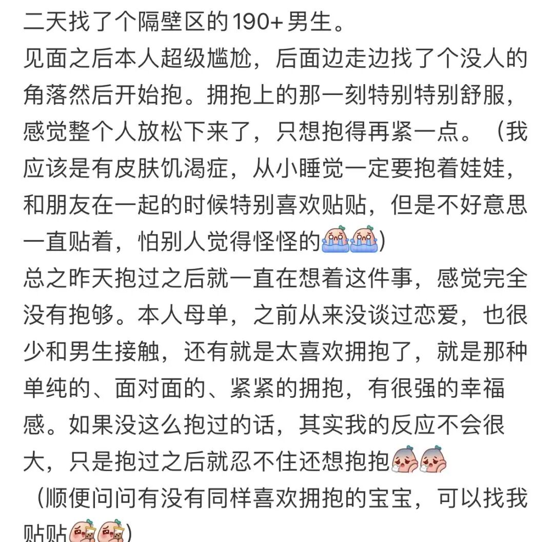 其实就是花钱买拥抱,最早是在某个社交平台火起来的。主打 “治愈解压”,目标客户多是压力大的年轻女性。