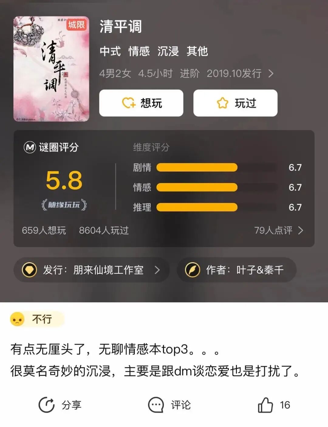 这个玩法不是最近才有的。早在 2019 年,古风剧本《清平调》就首次尝试加入恋爱设定,但当时好多人接受不了。