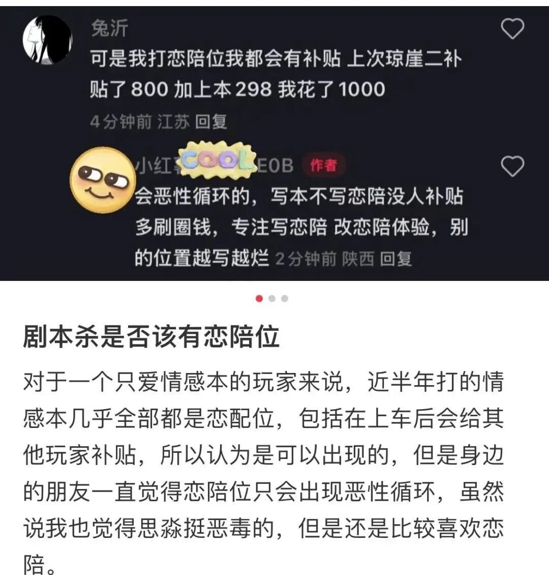 有恋陪 DM 的本叫 “恋陪本”,专门和 DM 谈恋爱的位置叫 “恋陪位”,其他玩家被称为“边位”。通常一个本就一到两个 C 位名额,僧多粥少得靠抢。