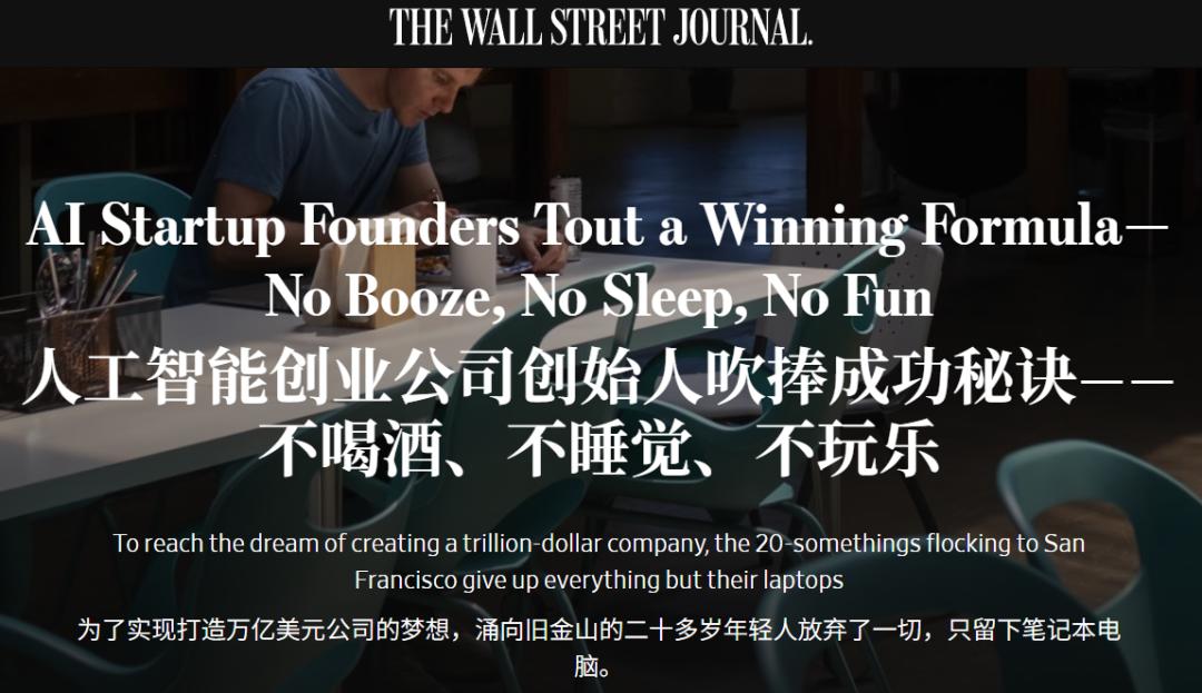 如果说「假装 AI」是创业者的面具,那么「苦行」就是他们的信仰。在硅谷的 AI 圈子,一种名为「不喝酒、不睡觉、没娱乐」(No Booze, No Sleep, No Fun)的新教条正在蔓延。对于这群平均年龄 20 出头的年轻人来说,享受生活被视为一种罪过,而「睡在办公室」则是通往十亿美元估值的唯一门票。