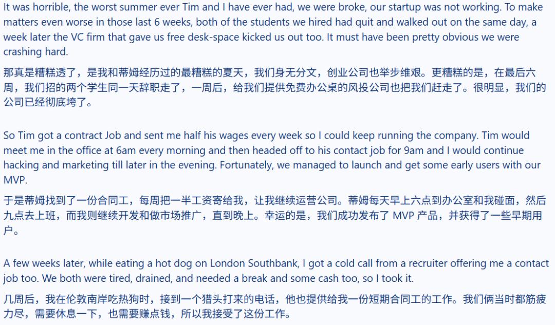 经典的创业故事往往带有一丝温情。比如视频编辑工具 VEED.IO 的故事:当公司耗尽资金、被赶出免费办公室后,联合创始人 Tim 并没有选择放弃,而是去找了一份合同工。他每天早上 6 点开始写代码,9 点去上班,然后每个月把一半的工资寄给全职坚持的合伙人,强行「输血」维持公司运转。