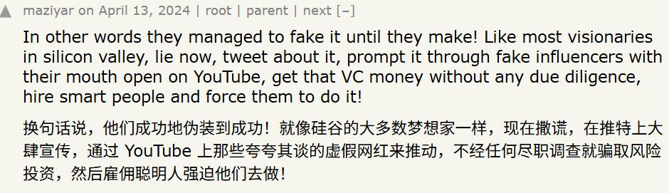 Hacker News 上的一位开发者一针见血地总结了这种「先吹牛,后实现」的危险策略:现在的剧本是:先撒谎…… 发推特吹嘘…… 拿到 VC 的钱…… 然后雇一群聪明人被迫把它做出来!