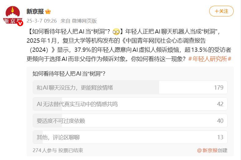 复旦大学等机构也在今年发布《中国青年网民社会心态调查报告(2024)》,当中显示37.9%的年轻人愿意向AI虚拟人倾诉烦恼,超13.5%的受访者更倾向于选择AI而非父母作为倾诉对象。