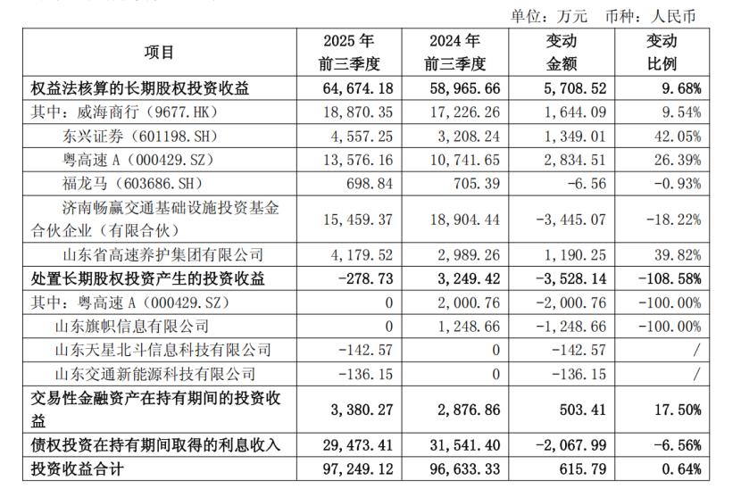 在波动的市场中,山东高速的投资收益已走出了一条稳健曲线。2025年前三季度,公司实现投资收益9.72亿元,占营业利润的23%。其中,粤高速A、威海银行、东兴证券和福龙马四个核心股权,合计贡献接近4亿元投资收益。