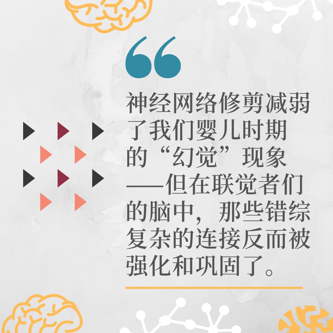 随着时间的推移,他们的感知会变得更加精确。毛瑞尔在此引用了俄勒冈大学的神经科学家海伦·纳威(Helen Neville)的文章。她1995年的研究表明,语言的刺激可在六个月大的婴儿脑中产生脑波,涵盖听觉和视觉区域。但是这会逐渐减弱:到三岁时,语言就会渐渐只刺激听觉区域。毛瑞尔从这些和其他研究中得出的结论是,婴儿脑中高度连接的神经网络会随着时间的推移减少,或是被他们所处的环境和经历“修剪”。她认为神经网络修剪的作用就是减弱婴儿的这种“幻觉”现象——但在联觉者们的脑中,那些错综复杂的连接反而被强化和巩固了。