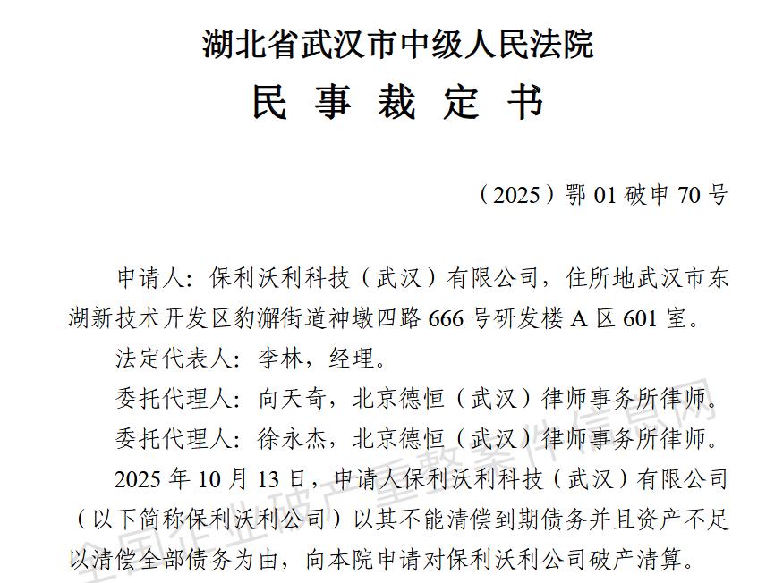 近日,保利沃利科技武汉有限公司(POLYVOLY)的破产清算获得法院受理,理由是不能清偿到期债务且资产不足以清偿全部债务。申请破产之前,公司已被超20家企业告上法庭。