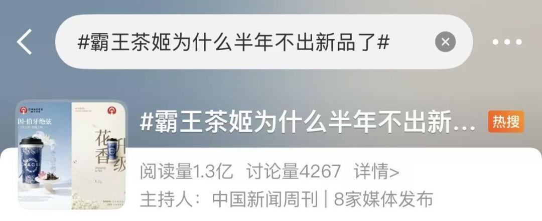 前几天,一则有关“霸王茶姬不上新”的新闻挂上微博热搜。据媒体报道,霸王茶姬已有半年没有推出新品,加盟商和消费者一个比一个急[3]。
