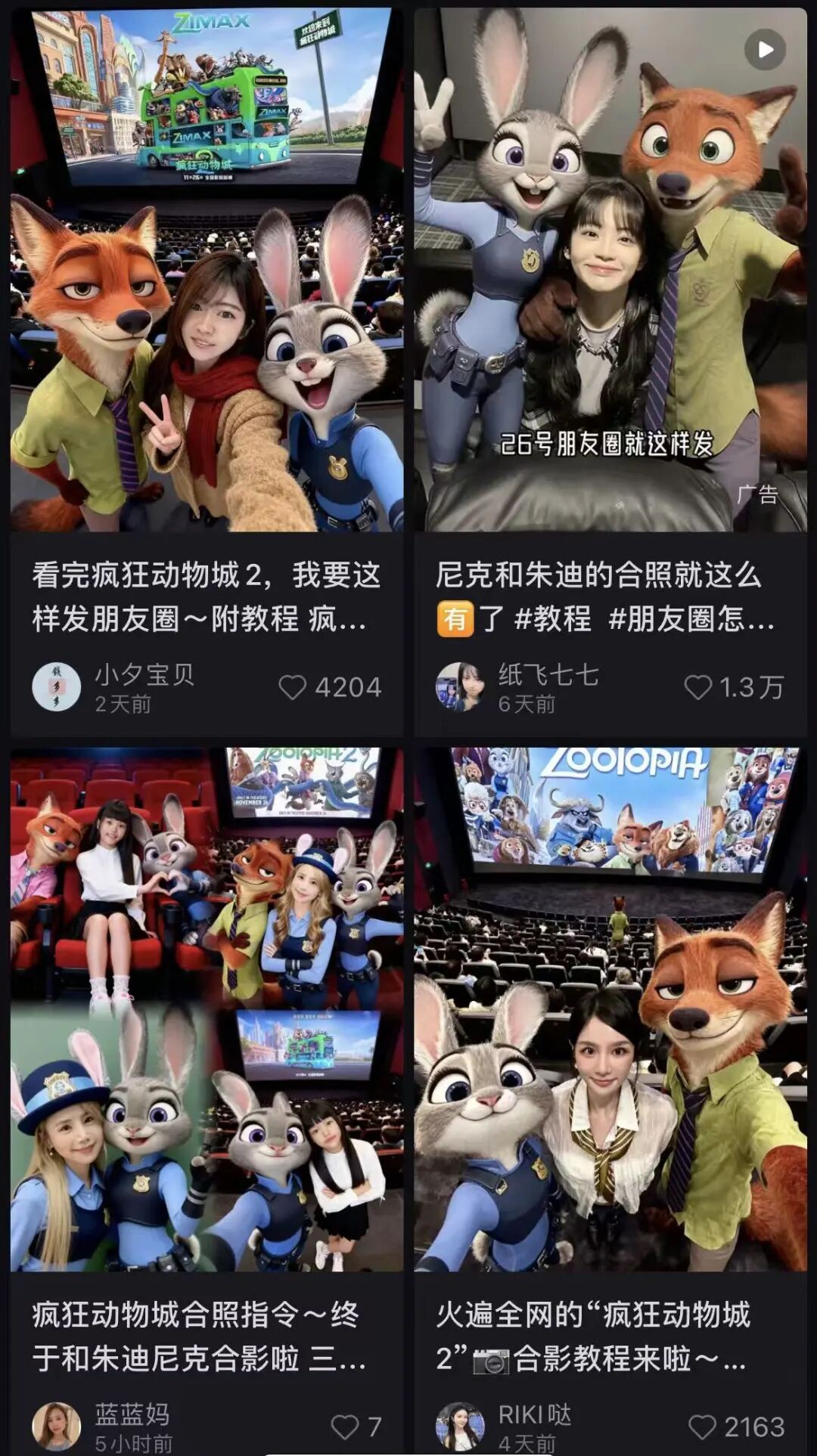 最典型的是在小红书、抖音、朋友圈等刷屏的AI合拍打卡:小红书上一条“疯狂动物城AI合拍”教程最高获1.2万赞。#疯狂动物城 话题下,跟风打卡的帖子,涵盖穿搭、妆容、探店等场景。为了能拍一张打卡照,许多人走进了电影院。