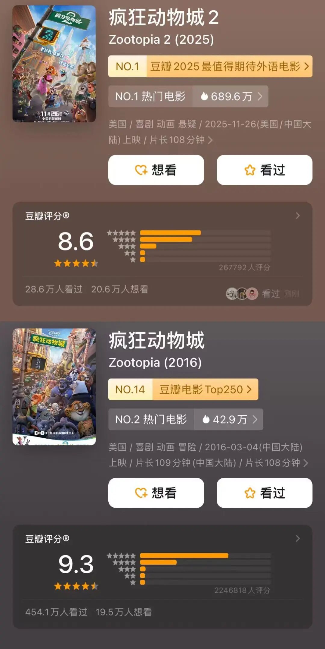 9年前的《疯狂动物城》可以说是迪士尼真正做到“全民观影”的现象级IP:内地总票房达到15.38亿,仅次于北美成为全球第二大票仓,豆瓣223万人打出9.3分。