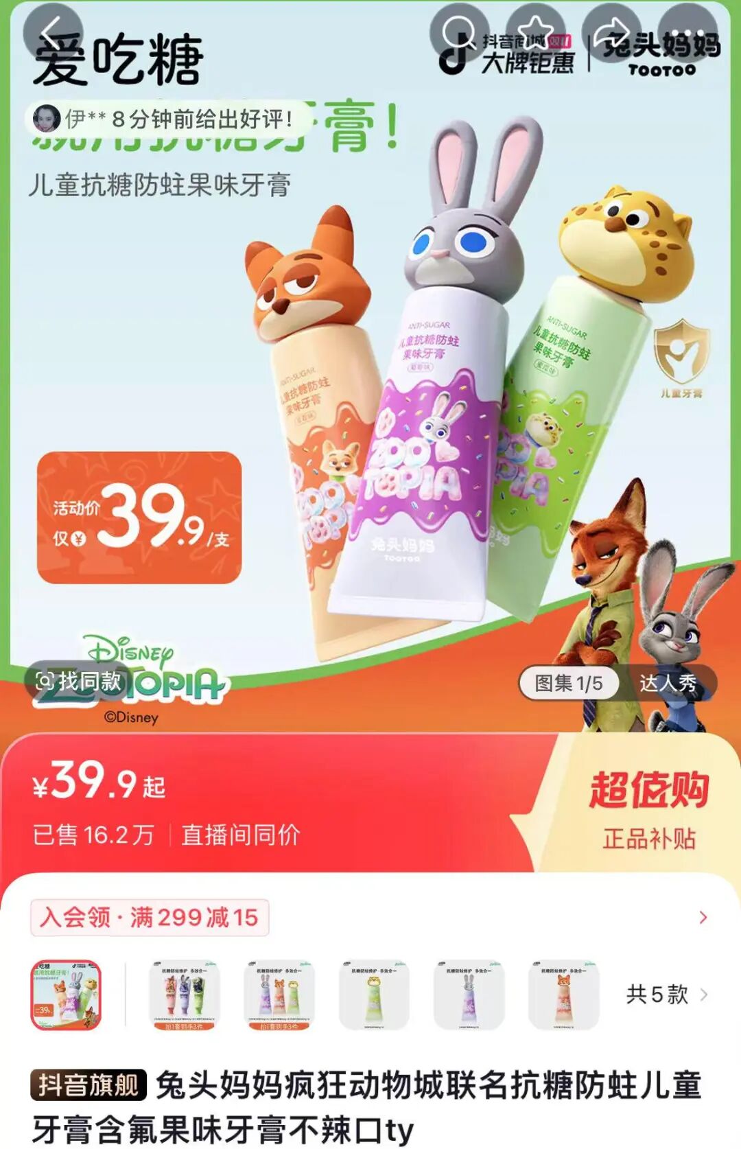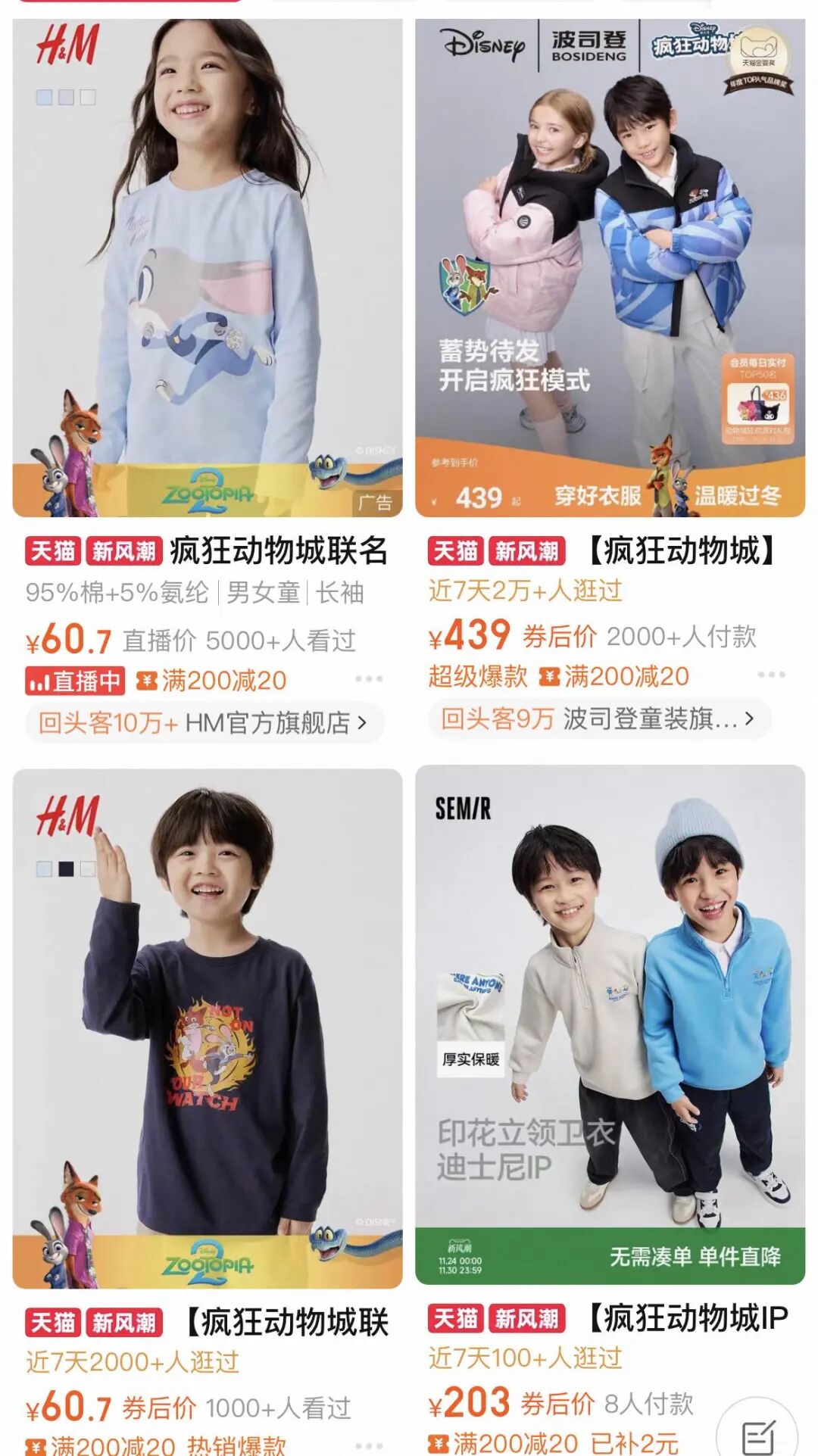 但小尺码的狐兔印花T恤、卫衣等仍然成了童装的热门,其中,波司登联名的儿童羽绒服淘宝单店销售量突破2000单,与兔头妈妈联名的儿童牙膏在抖音单店销量超16万笔;这足以证明《疯狂动物城》既能收割年轻人,也能够收割家长消费。