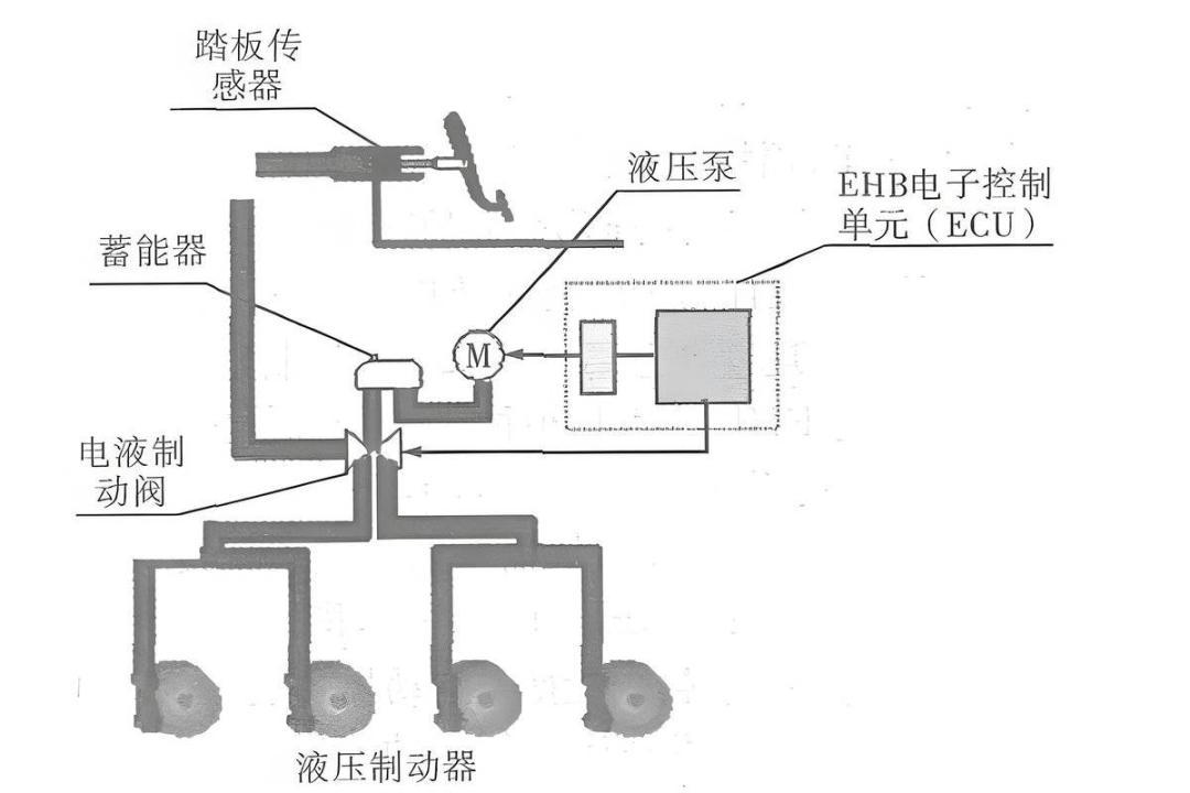 简单说,EHB 是用一堆电子元器件,把你的刹车踏板和刹车卡钳给分开,但实际你踩刹车,还是要把电信号传给液压系统,通过液压泵挤压液体,把压力给到刹车片上。