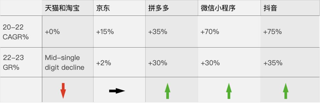 奥纬咨询针对主要渠道商品交易总额 (GMV) 演变的统计显示,从2020年开始,淘宝天猫与京东增长已开始减缓甚至进入负增长,而抖音电商、拼多多在以30%高度增长,如果任由该趋势持续,有推算认为,2027年抖音电商或将反超阿里。