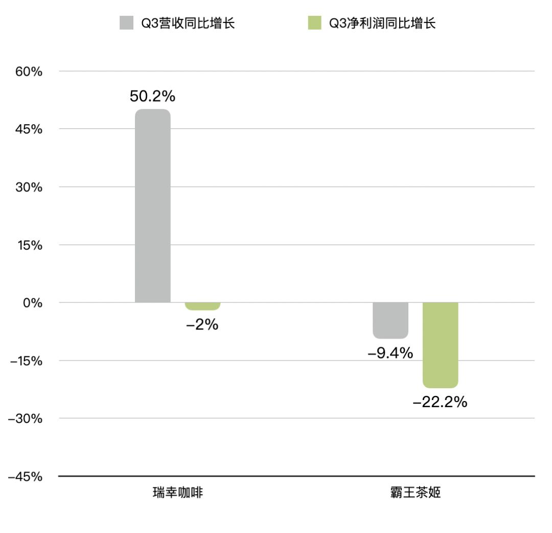 而霸王茶姬定位高端茶饮,均价在18元左右,为保持品牌调性,未参与这次大战,在这场薅羊毛大战中被分流,Q3营收和利润同比双双下降,其中营收32.08亿元,下降9.4%,经调整后净利润5.03 亿元,下降 22.2%。