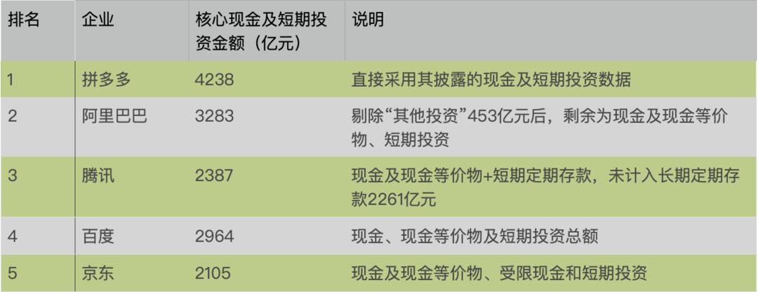 中国互联网企业“现金王”(包括核心现金及短期投资金额)排名发生变化,拼多多替代阿里,从第二位升至第一位: