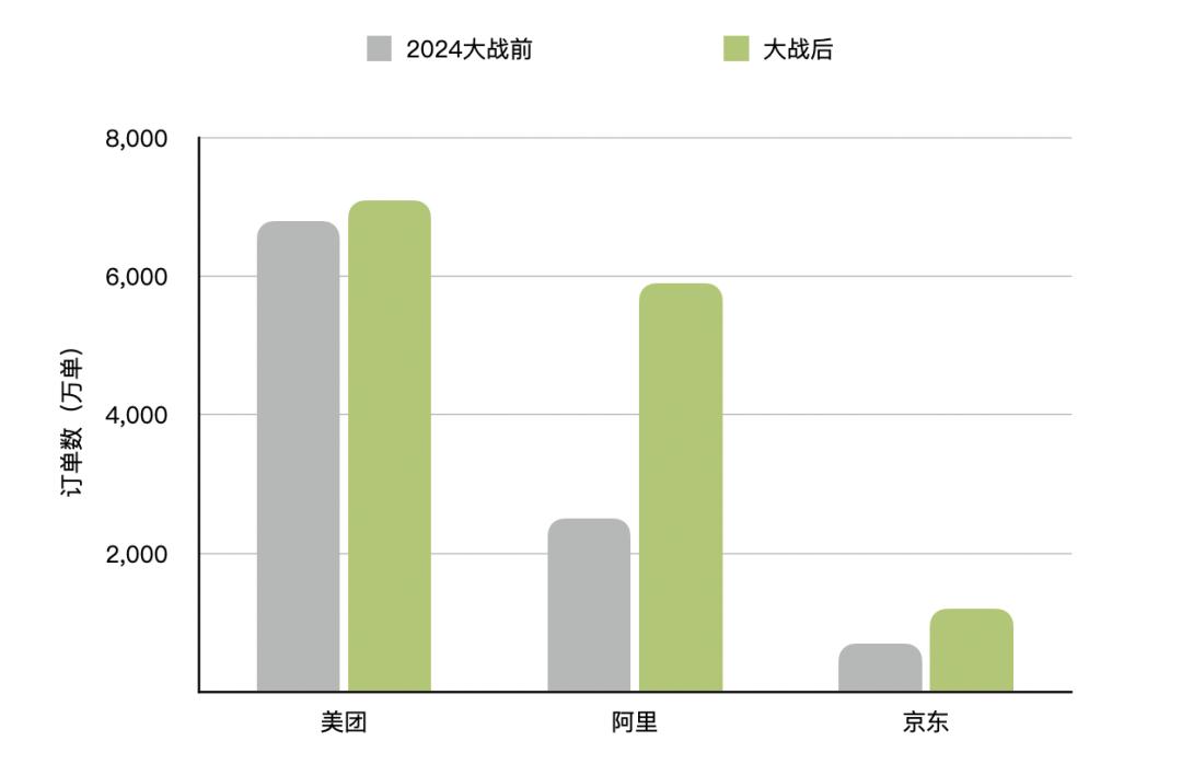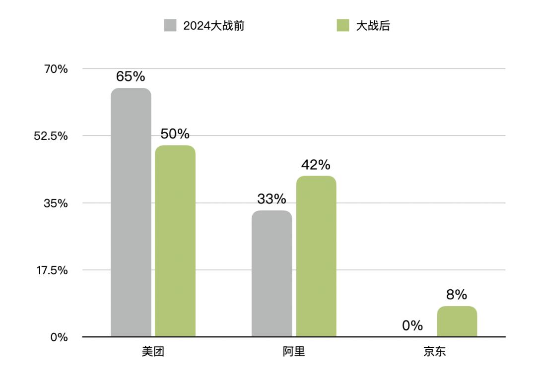这场即时零售大战经历数月争夺后,不同机构给出了大战前后各家的市占率变化。交银国际研报显示,在大战前的2024年,美团外卖占据65%的市场份额,饿了么33%,其他小型平台合计仅占 2%;另有行业分析提及,美团份额稳定在70%左右,饿了么约为 30%。