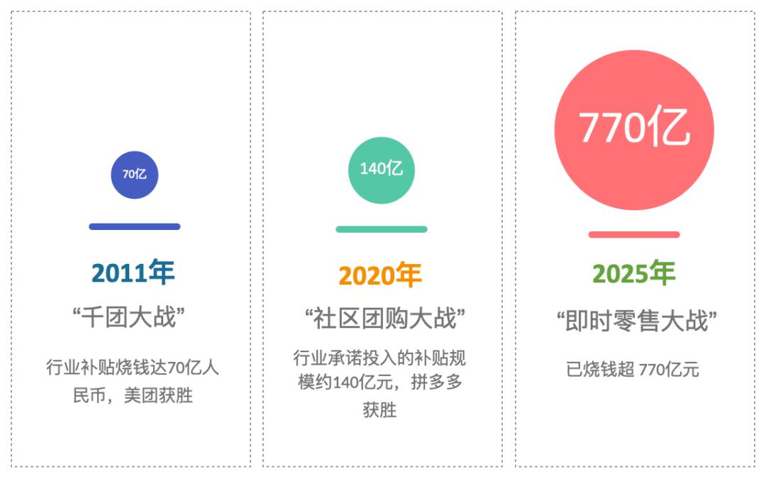 2011年,第一次 “千团大战”,行业补贴烧钱为70亿元,美团获胜。2020年,第二次“社区团购大战”,行业承诺投入的补贴规模约140亿元,拼多多获胜;2025年,“即时零售大战”,已烧钱超770亿元,且补贴规模仍在扩大。而此前的共享单车大战,烧钱为280亿元左右。