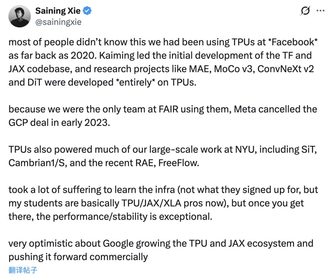 Clive对Meta的看法也被现实验证——没过多久谢赛宁就亲口证实,Meta早在2020年就已经开始使用TPU了。