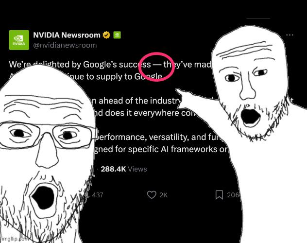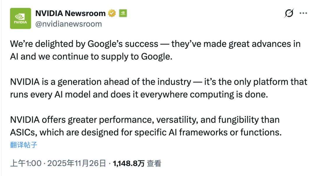 在Meta的新订单被曝光之后,英伟达这边也对谷歌表示了祝贺。