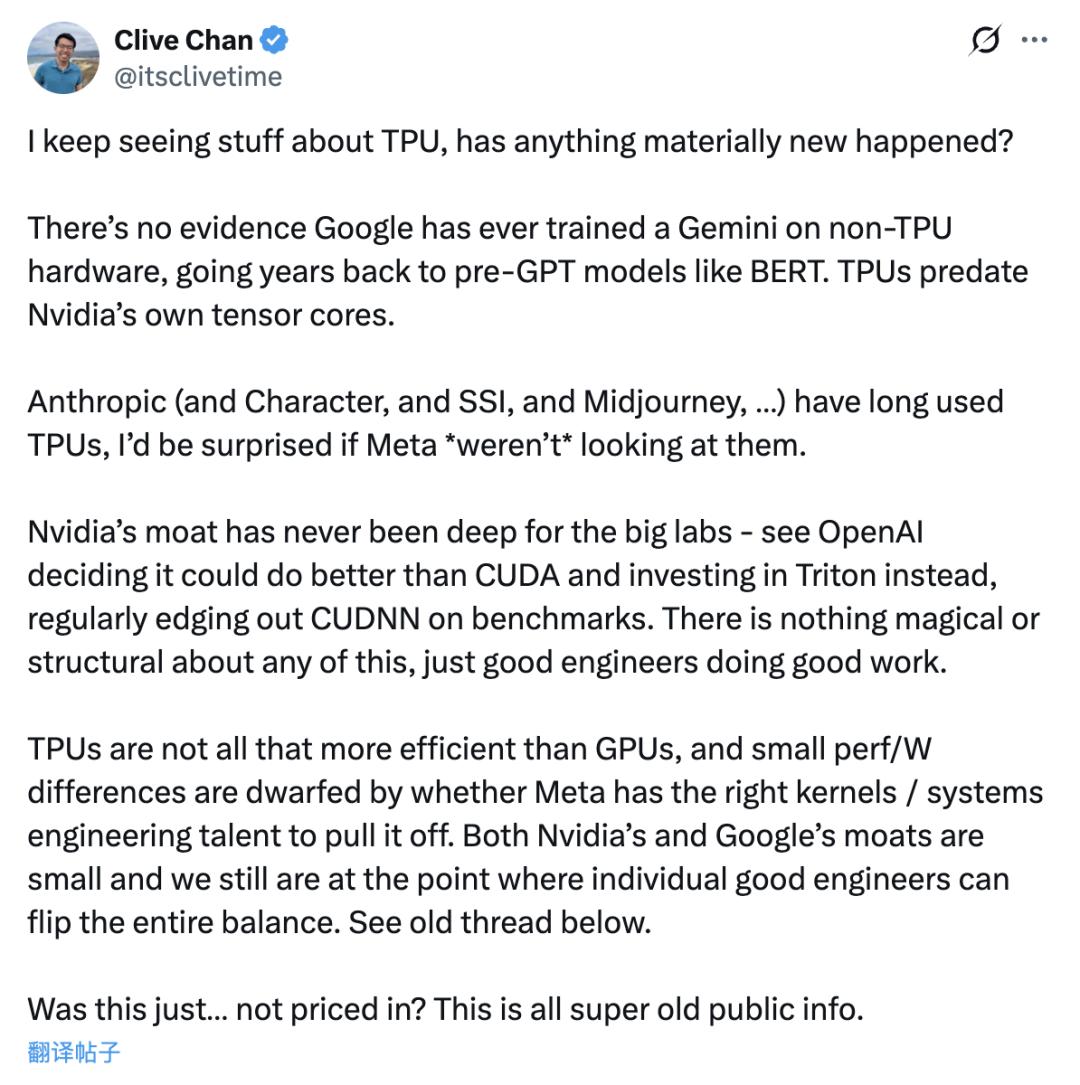 OpenAI技术人员Clive Chan表示,不仅谷歌自己的Gemini一直在TPU上训练,像Claude、生图模型MidJourney、Ilya的SSI,也全都用过TPU。