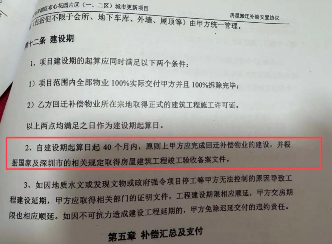 据业主向每经记者展示的房屋搬迁补偿安置协议:“自建设期起算日起40个月内,原则上甲方应完成补偿物业的建设,并根据国家和深圳市的相关规定取得房屋建筑工程竣工验收备案文件。”