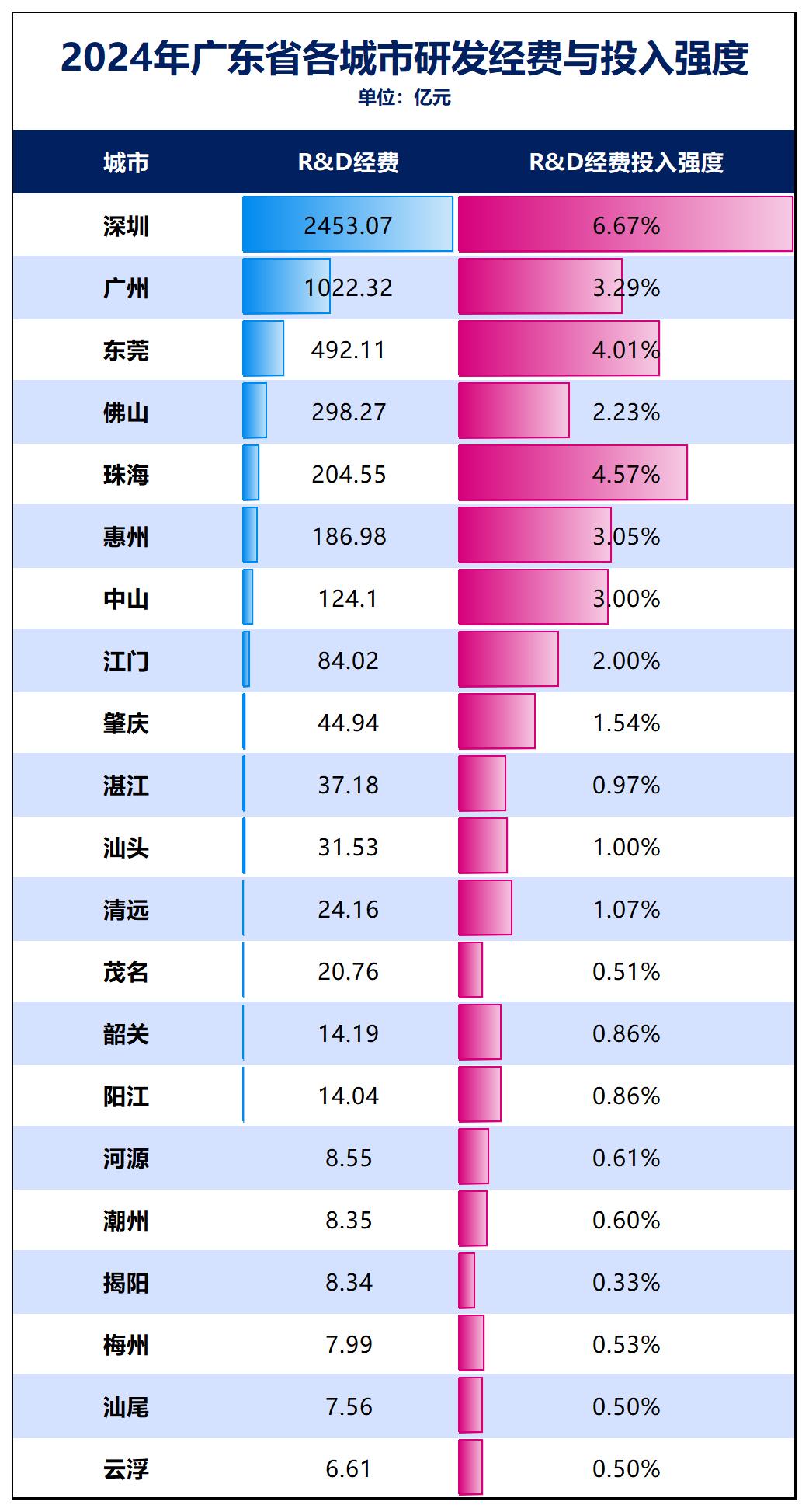 数据显示,2024年深圳市R&D经费投入达2453.07亿元,同比增长9.7%,研发强度(经费与GDP之比)6.67%。两个数据,均位居全省第一。
