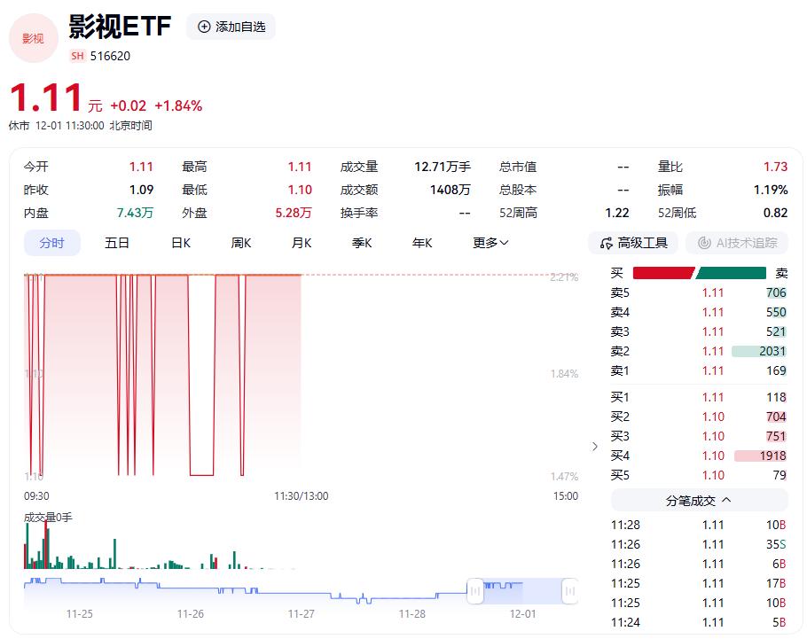 不仅仅是个股表现出色,影视 ETF 也跟着水涨船高。影视 ETF(516620)涨超 1.5% ,其跟踪的中证影视指数(930781)从沪深市场中选取涉及影视内容制作、发行、渠道运营以及网络剧、动漫制作等业务的上市公司证券作为指数样本,它的上涨,反映出整个影视行业相关上市公司证券的整体表现都在向好。