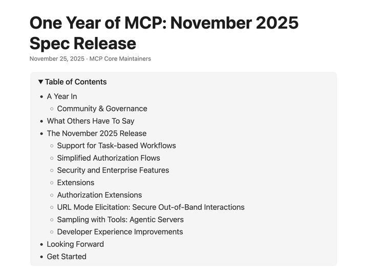 11 月 25 日,Anthropic 官方博客更新了一篇庆祝帖,宣布 MCP 正式满一周岁,配合发布的还有一份新版规范。