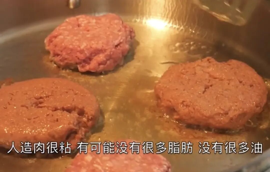 在煎制过程中,博主称,人造肉更粘锅,也不像真肉一样有很多油脂。