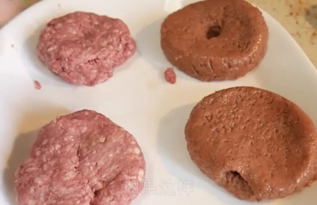 图片显示,左边为真肉饼,色泽呈现出鲜红色。而右边的人造肉,看上去颜色要比真肉深,甚至有些偏棕色。