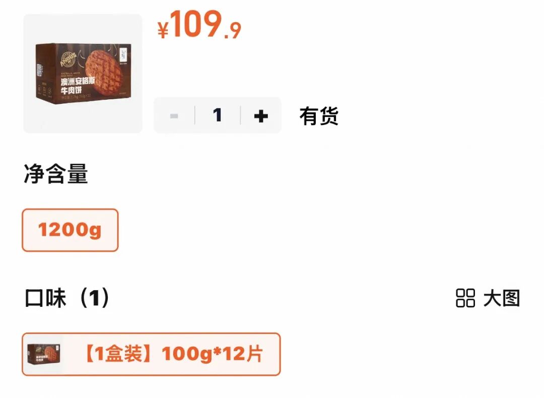 而某品牌的“澳洲安格斯牛肉饼”1200g(12片),售价约110元,换算为每100g,仅为9元。
