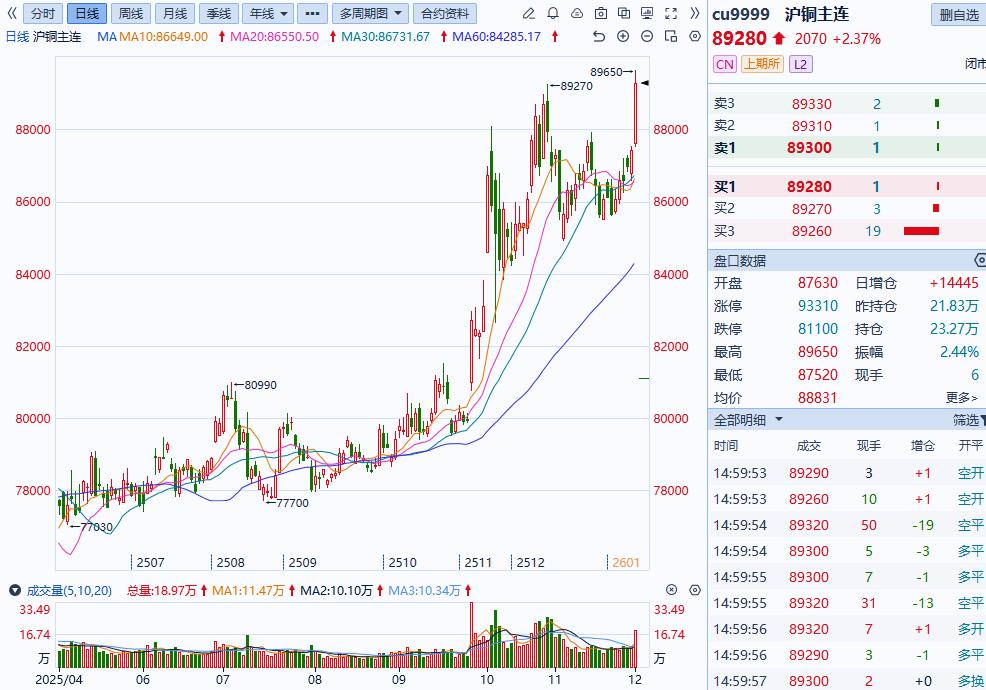 与此同时,铜价也表现强势,在上周五显著上涨后,今日LME铜期货价格继续大幅拉涨,国内沪铜主力合约站上89650元/吨,大涨超2.5%,盘中刷新历史新高。