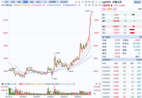 12月1日,沪银主力合约价格盘中突破13520元/公斤,涨幅超7%,收报5.86%,对比涨幅不足1.5%的黄金,白银堪称此世间已无敌手。