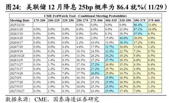 目前市场押注美联储在12月降息25个基点的概率已高达87.4%。高盛更是指出,鉴于就业市场走弱与政策风险管理需求,12月降息“几乎板上钉钉”。