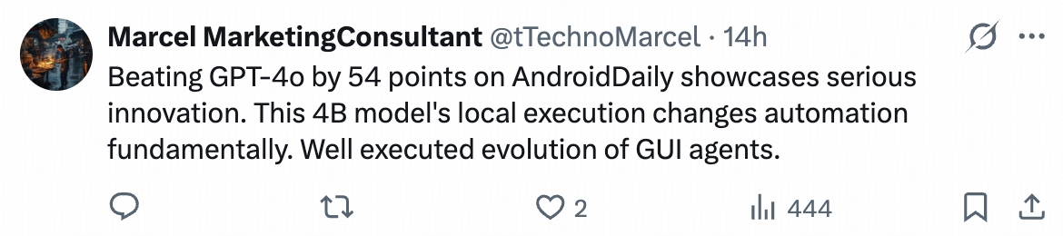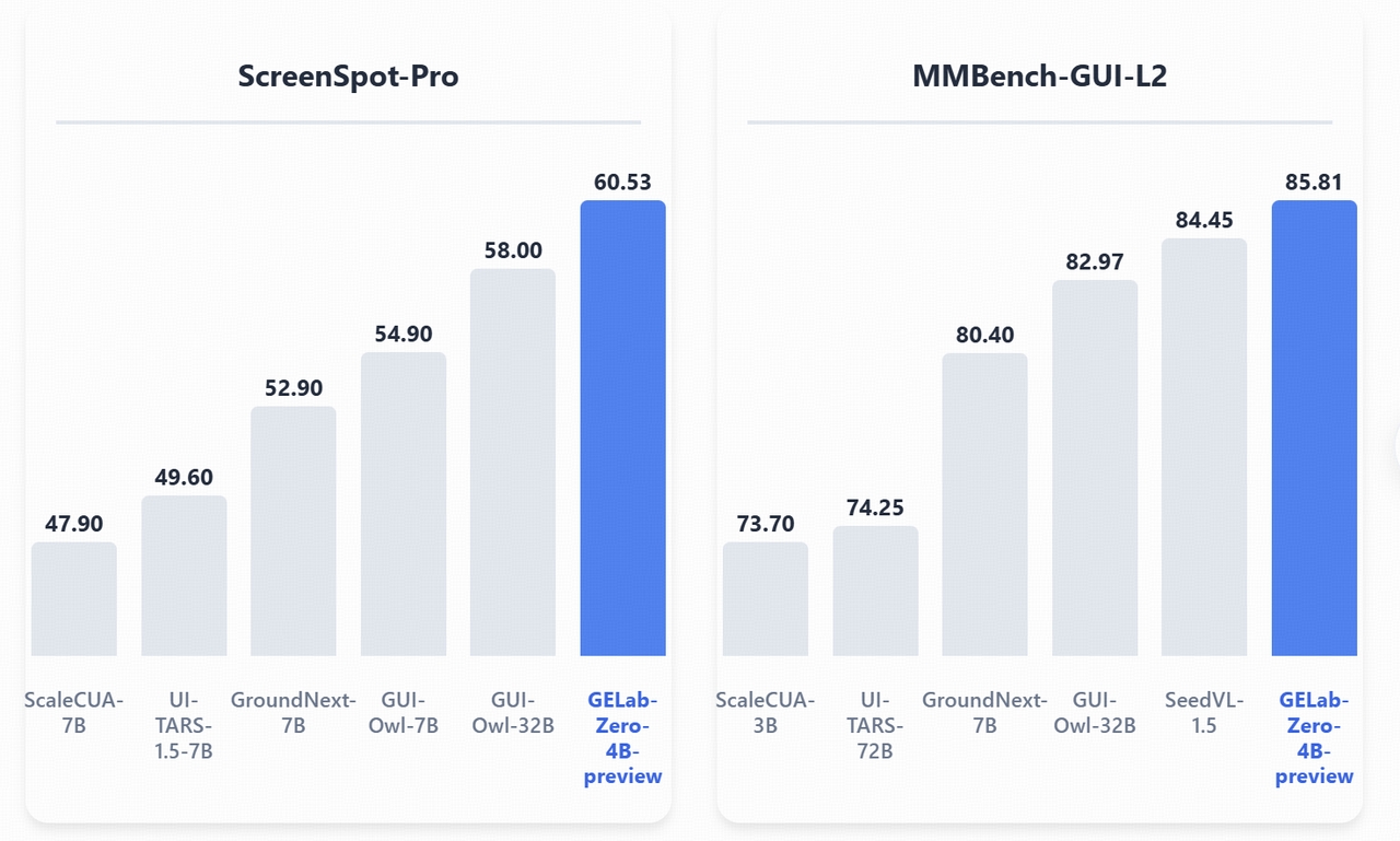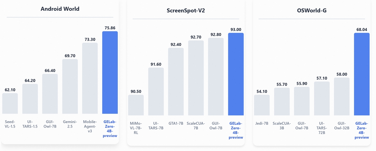 无独有偶,两天前大模型独角兽阶跃星辰开源了跟豆包手机助手同类型的GUI Agent 技术——名为 GELab-Zero 的套组,同时开源了4B 的GUI Agent 模型(GELab-Zero-4B-preview )以及完整的配套基建,支持手搓党一键部署。这款模型在手机端、电脑端等多个 GUI 榜单上全面刷新同尺寸模型性能纪录,取得 SOTA 成绩。因为通用任务执行能力强大, GELab-Zero 在 X 和 reddit 等海外社区引起了开发者的热议。