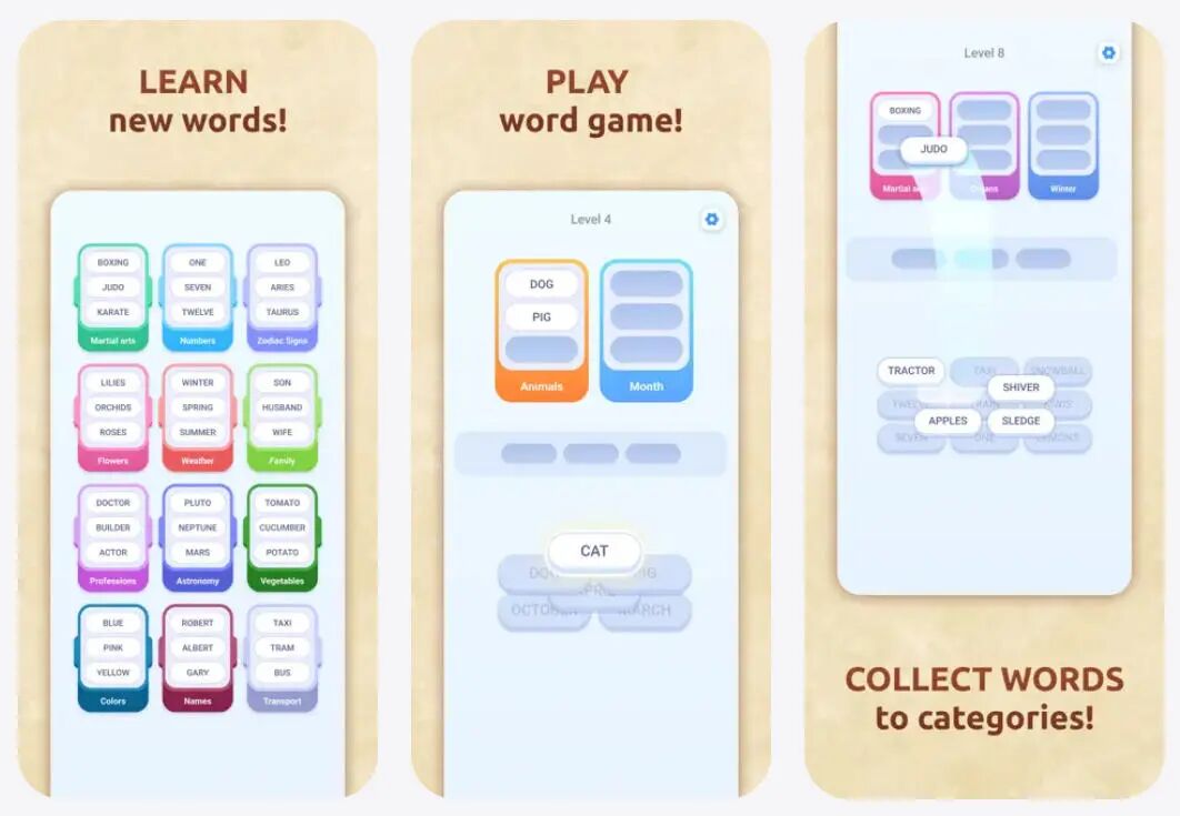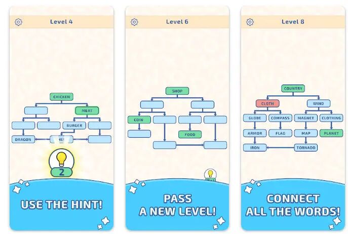 等到了后两款产品「Association Word Box」和「Association Chains」,HitApps 已经开始试验添加新机制来做出更多变化。「Association Word Box」开始提高单词类别的存在感,做成了一个虚拟的“盒子”,让玩家挑出单词放到这些“盒子”里,其实已经有了后面“母卡”机制的原型;而「Association Chains」的思路更是把不同单词类别做出了分叉树,让同类单词互相连接,形成单词类别这个“树干”延伸出来的不同枝丫,其实也有了接龙的感觉。