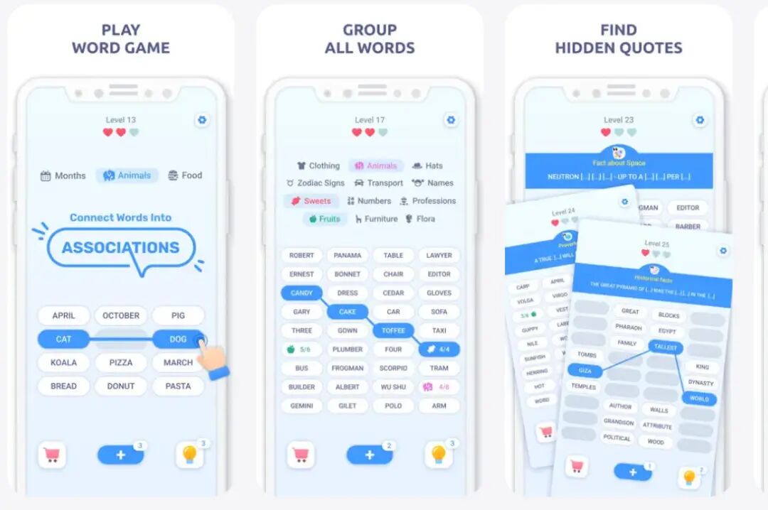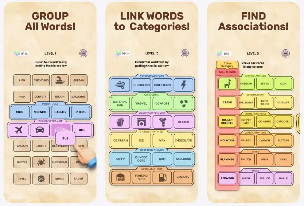 最早上线的「Associations Word Connections」只是单纯的让玩家根据单词所属类别连线分类 | 图片来源:Associations Word Connections