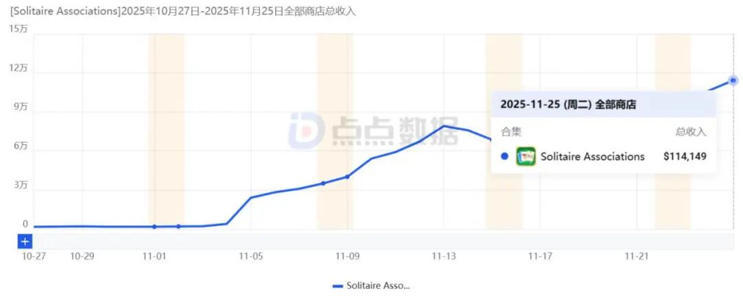 「Solitaire Associations Journey」的日流水从 11 月初开始增长,截至 11 月 25 日已经突破 11 万美元 | 数据来源:点点数据