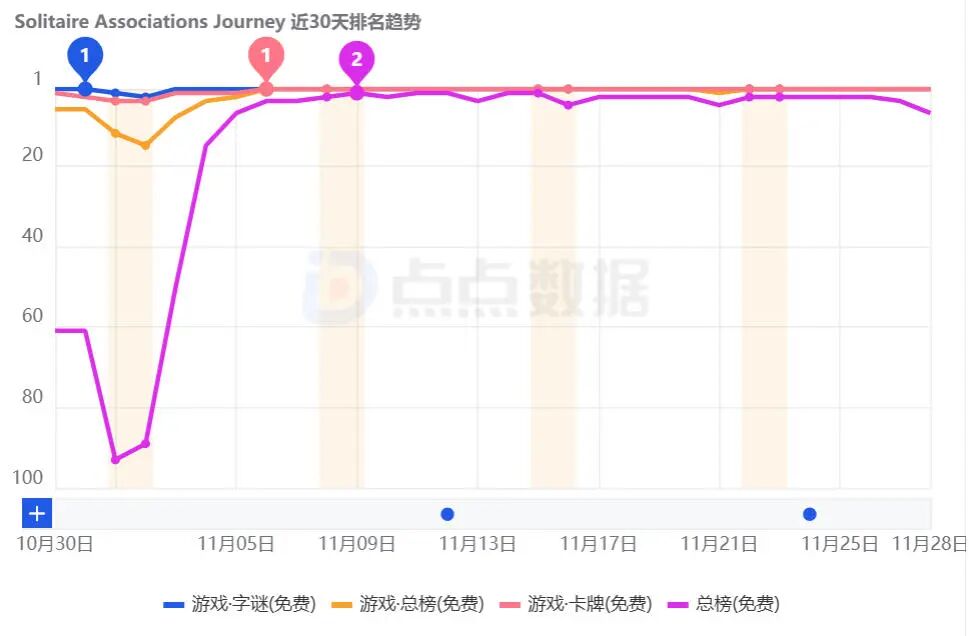 「Solitaire Associations Journey」在过去 30 天内长期处于美国 iOS 游戏和下载总榜 Top 3 | 数据来源:点点数据