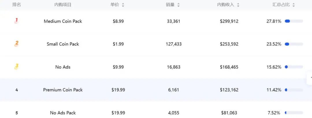 目前游戏在美国 iOS 端流水占比前 3 的内购商品分别是中等金币包(1500 枚,正好是续命 1 次的价格)、小型金币包以及永久去除插播广告 | 数据来源:点点数据