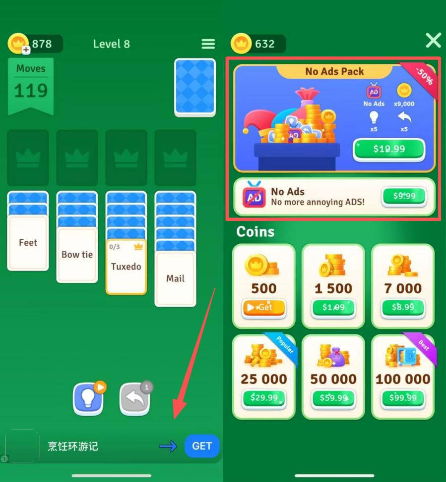 目前「Solitaire Associations Journey」的屏幕下方会出现横幅广告(左图 1),此外去除插播广告的付费包也被放在商店页面顶端推送(左图 2)| 图片来源:Solitaire Associations Journey