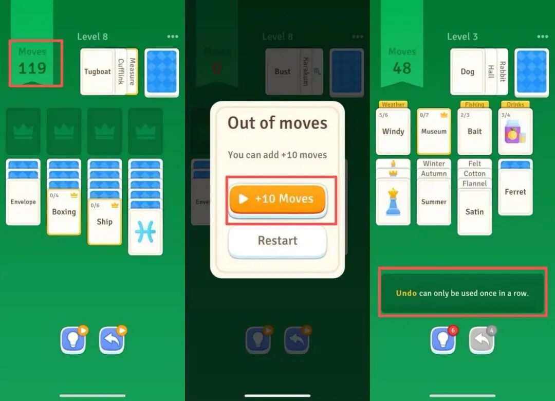截止到 9 月末,「Solitaire Associations Journey」还只有 IAA 内容,主要节点是让玩家看广告来增加移动纸牌步数(左图 2),以及换取提示操作和悔牌(左图 3,悔牌只能在一个队列里用一次)| 图片来源:Solitaire Associations Journey