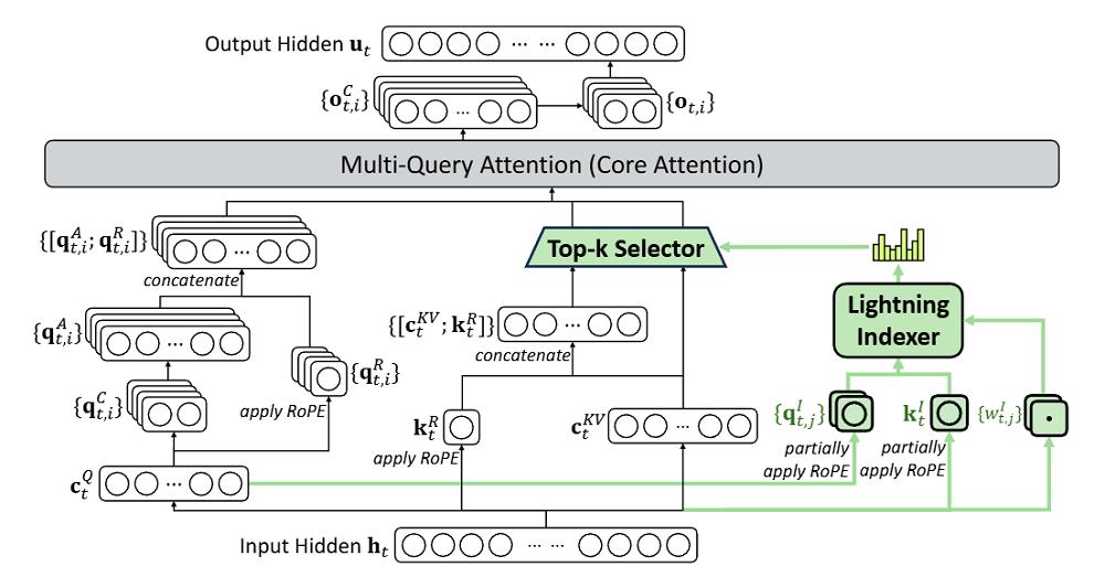 这一选择是通过闪电索引器(lightning indexer)实现的。闪电索引器计算查询token与前序token的索引分数,以决定应该选择哪些token进行计算。鉴于闪电索引器头数少且可在FP8下实现,其计算效率非常出色。