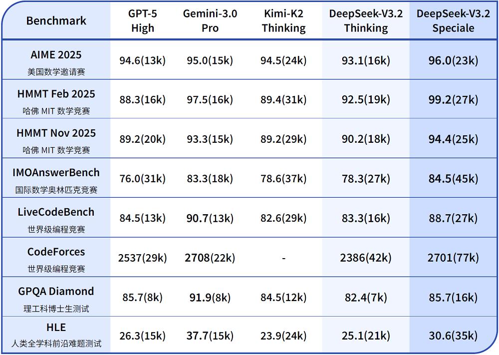 DeepSeek称,标准版的DeepSeek-V3.2在公开的推理类基准测试中,达到了GPT-5的水平,仅略低于Gemini-3.0-Pro;相比Kimi-K2-Thinking,V3.2的输出长度大幅降低,显著减少了计算开销与用户等待时间。