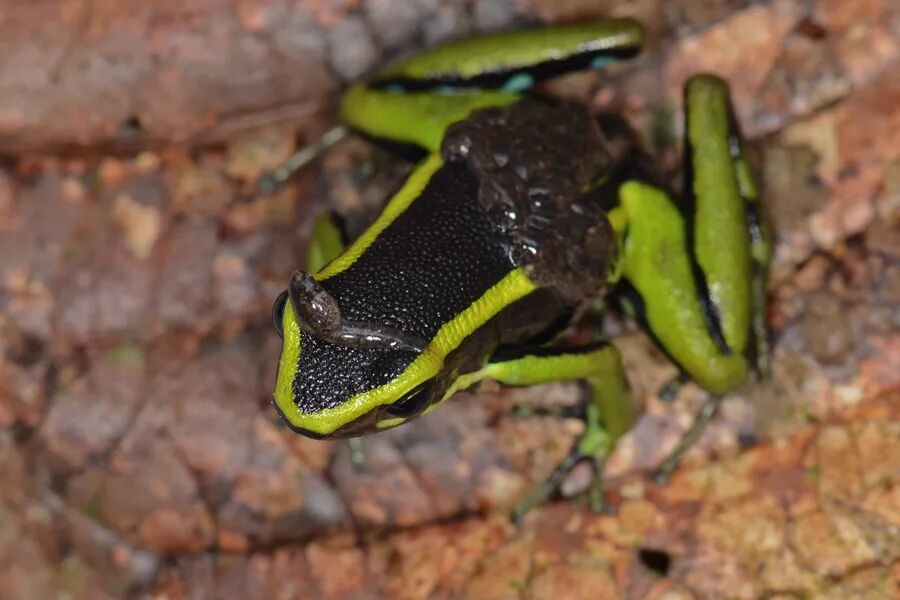 三条纹箭毒蛙(Ameerega trivittata)是世界上最毒的蛙之一,它有着标志性的三条黄绿色亮纹。箭毒蛙的毒素主要在皮肤表面,如果吞食它,或是伤口、眼睛黏膜接触到了它表面的毒素,就会中毒。