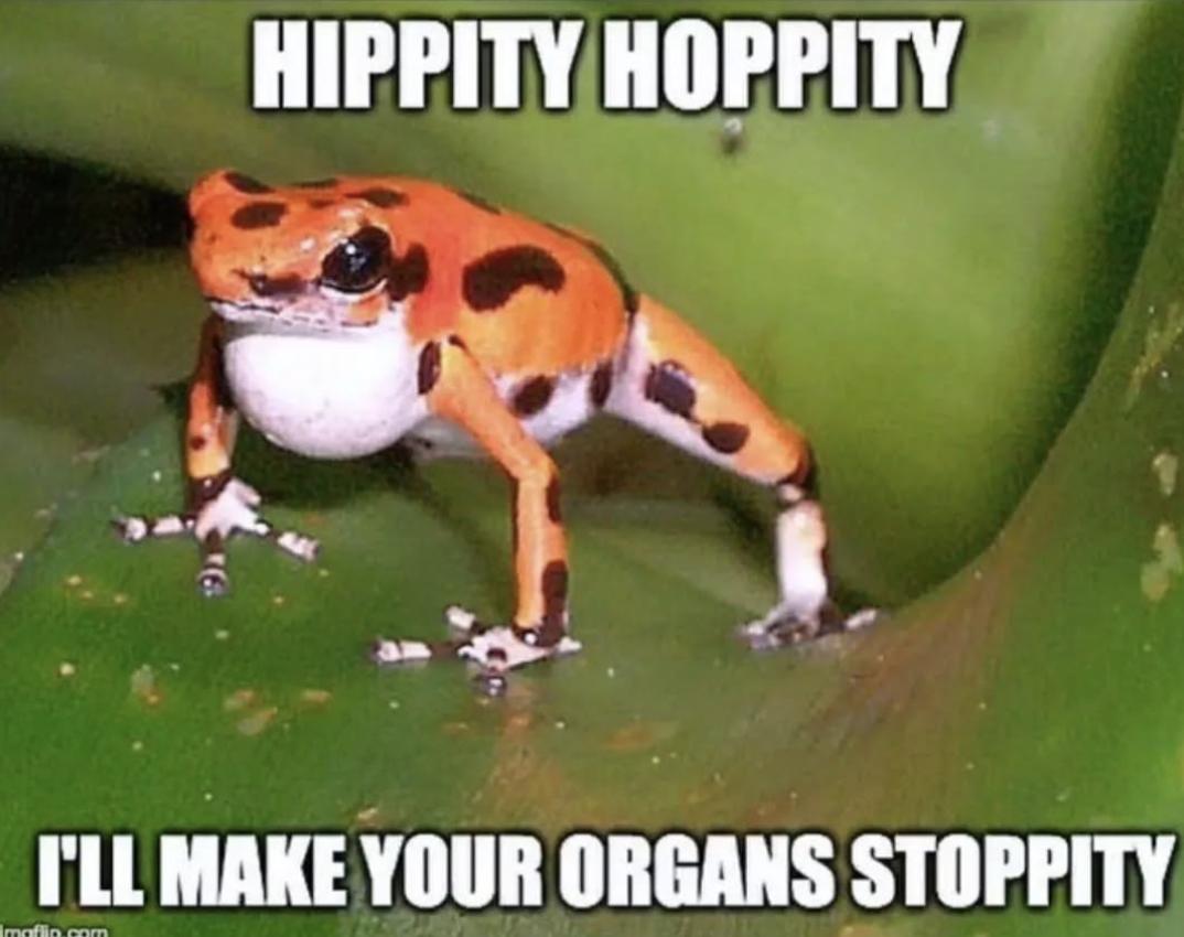 箭毒蛙的皮肤上的致命毒素主要由这几种构成:类毒素PTX族,戏蛙毒素HTX族,十氢喹啉DHQ族,以及其他多种脂溶性生物碱。这些毒素会干扰神经、肌肉,改变钠钾离子通道功能,让人感到麻木、肌无力、恶心呕吐或心悸。