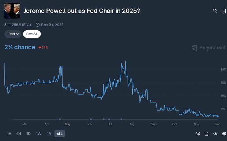 截至目前,预测平台Polymarket数据显示,市场预期鲍威尔在2025年离任美联储主席的概率仅为2%。