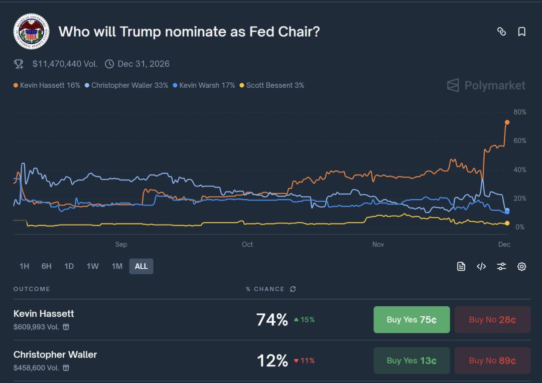 在小道消息甚嚣尘上的同一天,美国总统特朗普宣布,他已经确定了下任美联储主席的人选,将在近期公布。从预测平台Polymarket的数据来看,白宫国家经济委员会主任凯文·哈塞特获提名的概率高达74%。